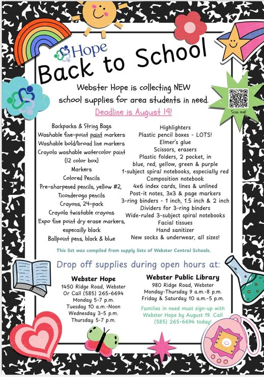 Webster Hope is collecting NEW supplies from now through Aug. 19 to stuff in backpacks for children in our community who are in need. The entire wish list is on the flyer here, but you can also see the list on the Webster NY Hope Facebook page.