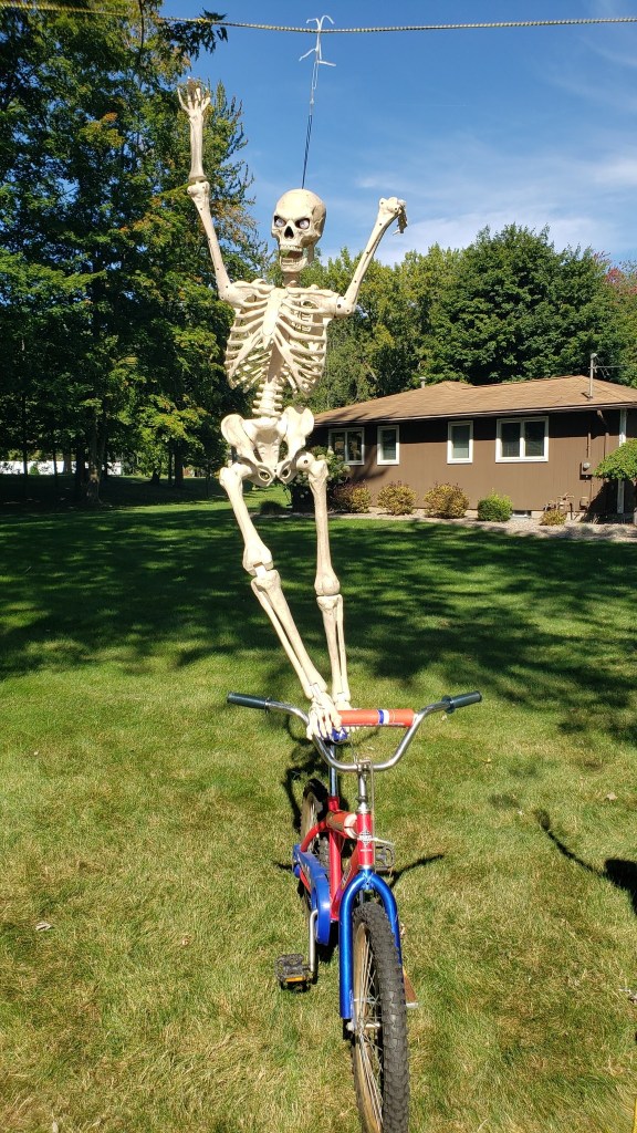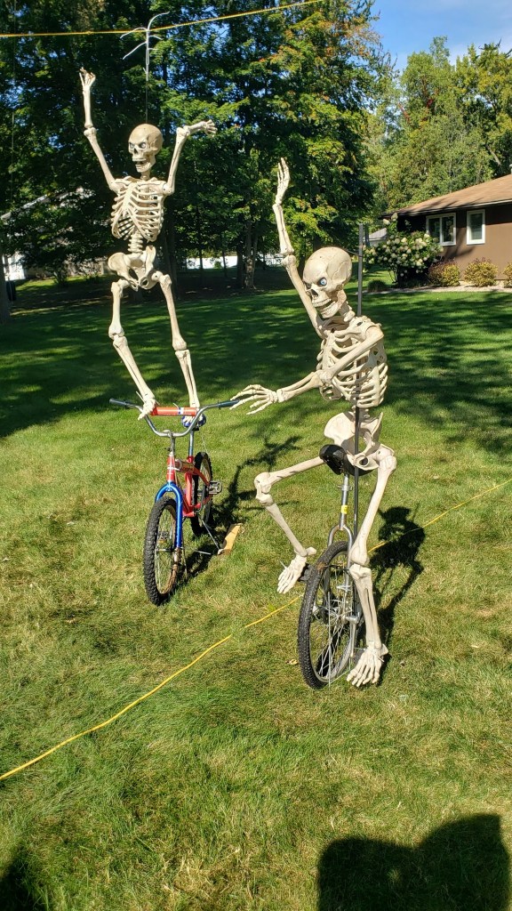 This season, the silly skeletons (and there are at least three more of them) appear to be competing in a bike race. But they’re not taking the race very seriously; one is perched upside down on his handlebars, one is standing on the handlebars, two are riding piggyback, another has chosen to compete on a unicycle, and yet another on a scooter (he appears to be winning the race).