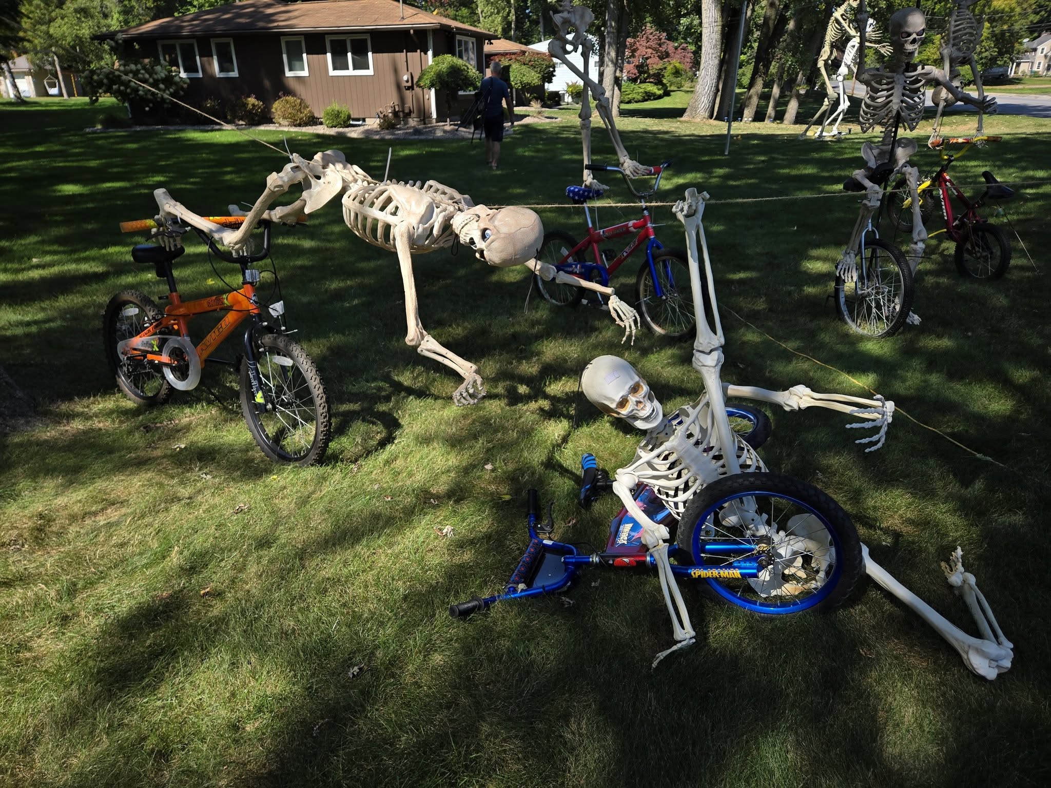 Plus, off to the left side of the scene, two other skeletons apparently had a bike accident. One is flying through the air after being catapulted over his handlebars. And if you think this is all spooky and bizarre during the day, you got to see it at night.