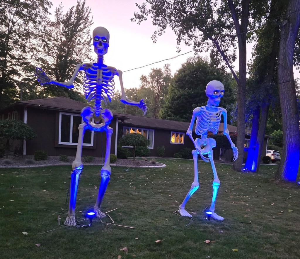Last year, George gave the big daddy a slightly smaller (10-foot tall) companion. And since that wasn’t nearly enough, he and his family also created a playground scene to accompany them, with a half dozen smaller skeletons swinging on swings, hanging upside down on a bar, and testing the waters in a kiddie pool (that skeleton had to have a mask and snorkel, just in case).