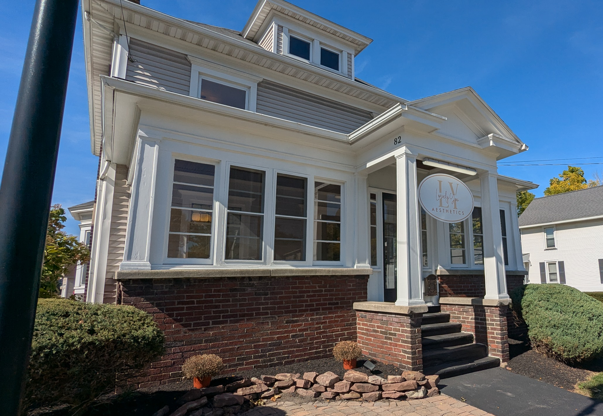 Located at 82 North Ave., Lovely You Aesthetics offers a wide variety of services including bio repeels, chemical peels, micro needling, Botox, fillers, personal skin care evaluations, weight management and more. The location is a beautiful old two-story house built in 1914 which still holds much of its original charm including leaded glass, stained glass windows, and coffered ceilings. There are two treatment rooms downstairs, four treatment rooms upstairs, and two bathrooms.