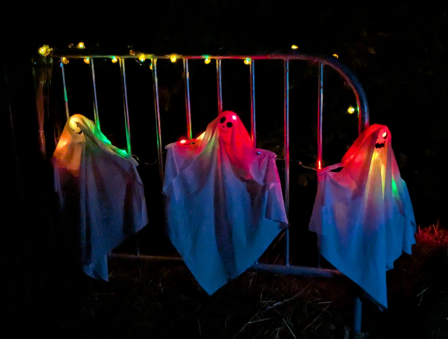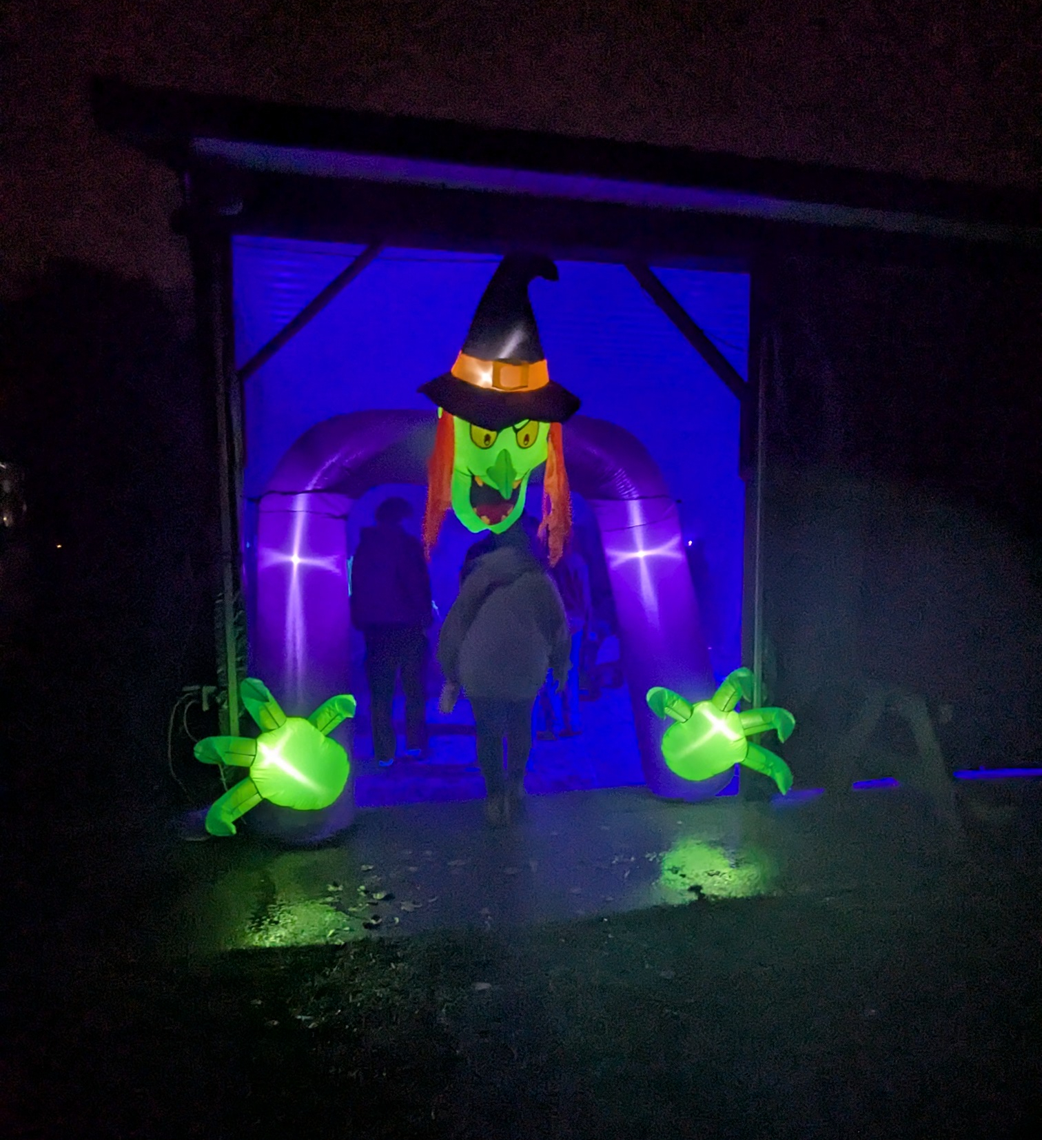 But those who did walk the trail enjoyed hundreds of creatively carved pumpkins and colorful lights illuminating the trail, lots of spooky ghost and alien decorations, an actual witch cackling and casting spells as she cooked up something vile in her cauldron, and a really cool “haunted” house. And at the end, Rec Center staffers gamely stood at their posts, handing out donuts, apples and cider, taking photos and helping kids go down the roll-y slide (the kids definitely didn’t seem to mind the weather). Kudos also to all of the families who were still arriving, with umbrellas, as I walked back to my car.