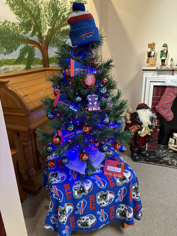 Taking first place this year, with 84 votes, was the tree decorated by the Webster Comfort Care Home. (This is the third year in a row that Webster Comfort Care has taken the top spot. We’re talking a dynasty here.) Coming in a close second with 78 votes was the Go Bills! tree designed by Webster Museum volunteer Gwen Hoffman. I didn’t vote for this one, but I thought it might be a fan favorite.