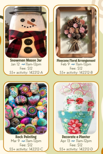 It’s called Craft Co., a crafting group which meets the second Monday of every month from 11 a.m. to noon. Upcoming crafts include a Pinecone Floral Arrangement (Feb. 9), Rock Painting on March 9 and Decorate a Planter on April 13. Cost for each session is $12. Register for Activity #142212.