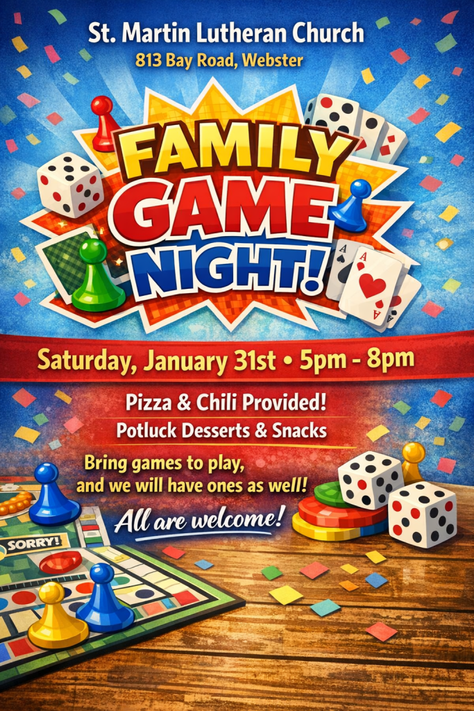 Family Game Night is this Saturday, January 31, from 5:00 to 8:00 p.m. at St. Martin Lutheran Church, 813 Bay Road in Webster. For more information, email stmartinwebster@gmail.com or call (585) 671-1899.