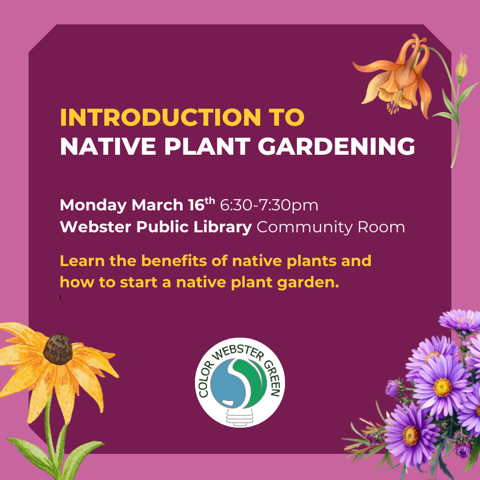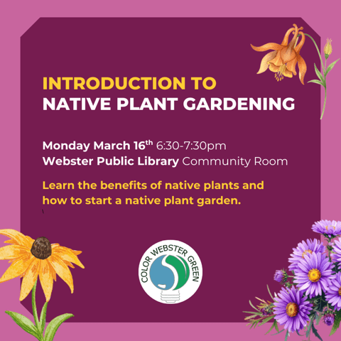 Color Webster Green is planning a special presentation on Monday March 16, an Introduction to Native Plant Gardening. Instructor Jill Carter from Color Penfield Green will teach how to start a native plant garden. Native plants provide habitat for pollinators, birds, and other wildlife. They’re also a beautiful addition to your home landscape. This class will give an introduction to native trees, shrubs and perennials and where to source them.