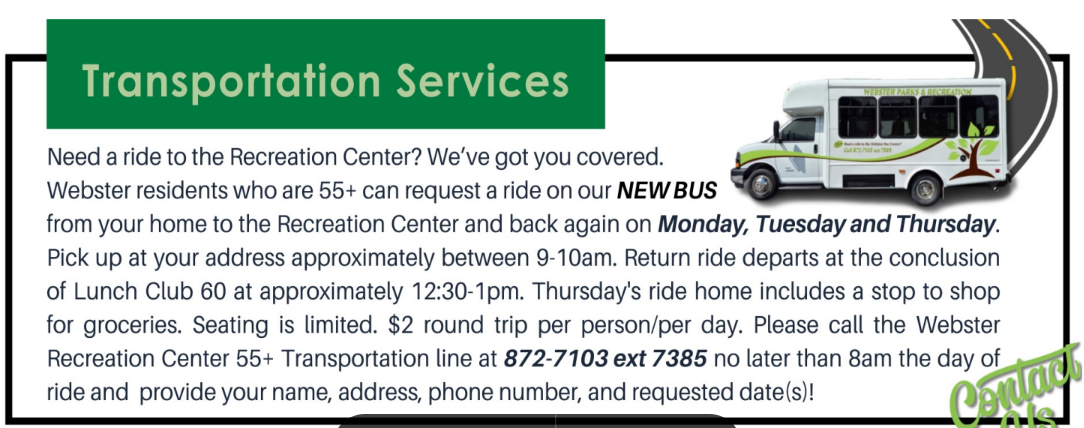 - Tuesday March 17: Meet Alex Scialdone, Webster’s new Town Supervisor. To register, look for activity# 146940-K
