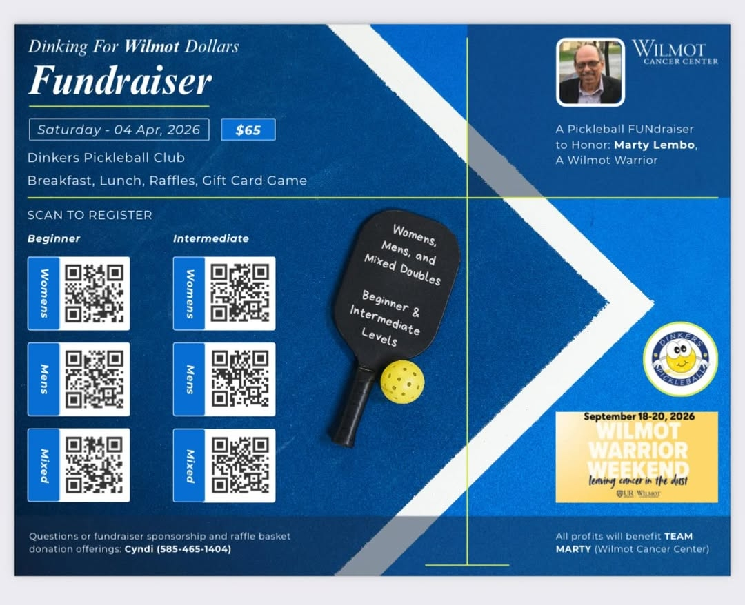 The Sip, Savor & Support event and the pickleball tournament are both being held in honor of Marty Lembo, who passed away in 2018 after a courageous battle with colon cancer. His memory lives on through Team Marty, a group of friends and family members who continue to raise funds in his name to benefit the Wilmot Cancer Center. The “Dinking for Wilmot Dollars” pickleball tournament is one of their biggest events, scheduled this year for Saturday, April 4 at Dinkers Pickleball in Fairport.