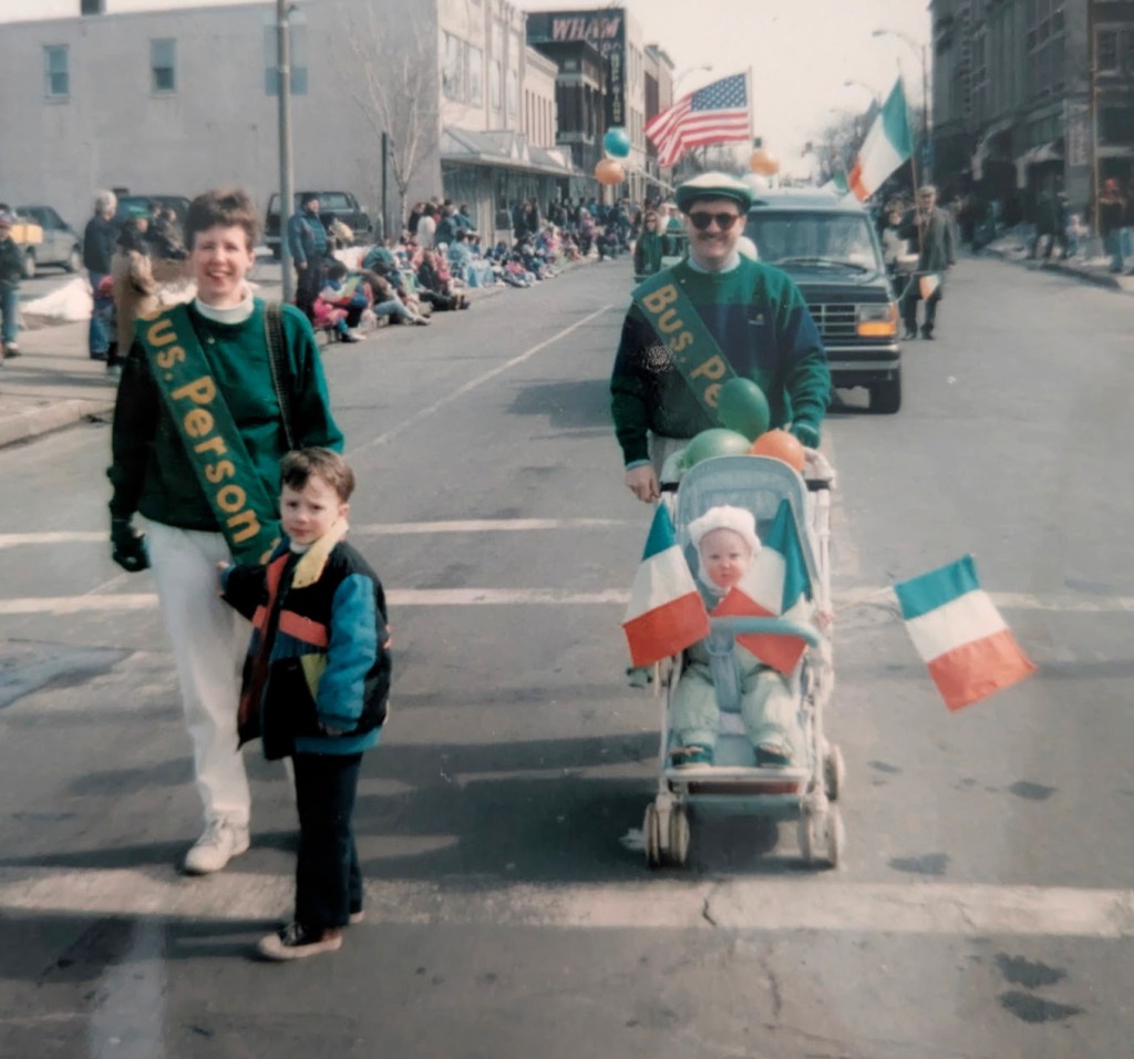 As a fun aside, this was not the first time I walked in the Rochester St. Patrick’s Day Parade. Back in 1995, my husband Jack and I were honored as the parade’s Business People of the Year, in recognition of our Irish Insider newsletter, which we began in 1992. Pictured here are Jack and me with our son Sean (then 5) and daughter Erin (not quite a year).