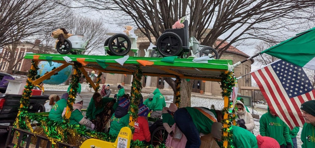 The Bella’s Bumbas float was pretty great. It was covered in bunting and flags and streamers. Several children sat inside the wagon on hay bales, and others rode Bumba wheelchairs as they were pushed down the street by helpful adults. Six more Bumba chairs were strapped to the top, illustrating the great variety of designs which Marty and Rebecca individualize for the children they serve.