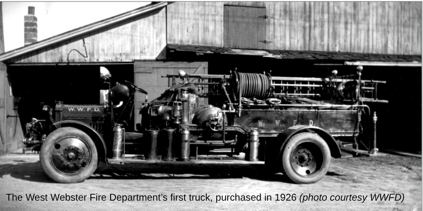 After the fire, a community group called the “Social 20” took on the task of increasing fire protection in West Webster. On May 3, 1926, the West Webster Firemen’s Association held their first meeting. They began with only $75 to the organization’s name, but by the end of the month had raised enough to purchase a Federal truck chassis for $1,000. They built their first truck using parts from a decommissioned Rochester Fire Department chemical hose cart.