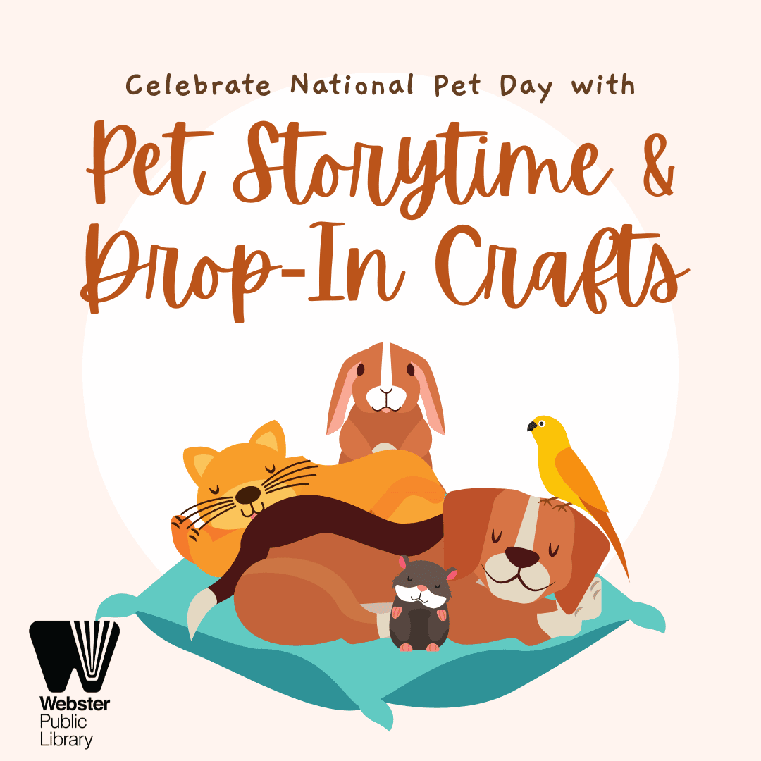 - Pet Storytime and Drop-in Crafts, Saturday April 11. It’s National Pet Day! Storytime begins at 10:30 a.m., and pet-themed crafts will be available from 11 a.m. to 4 p.m. All ages are welcome. No registration is required.