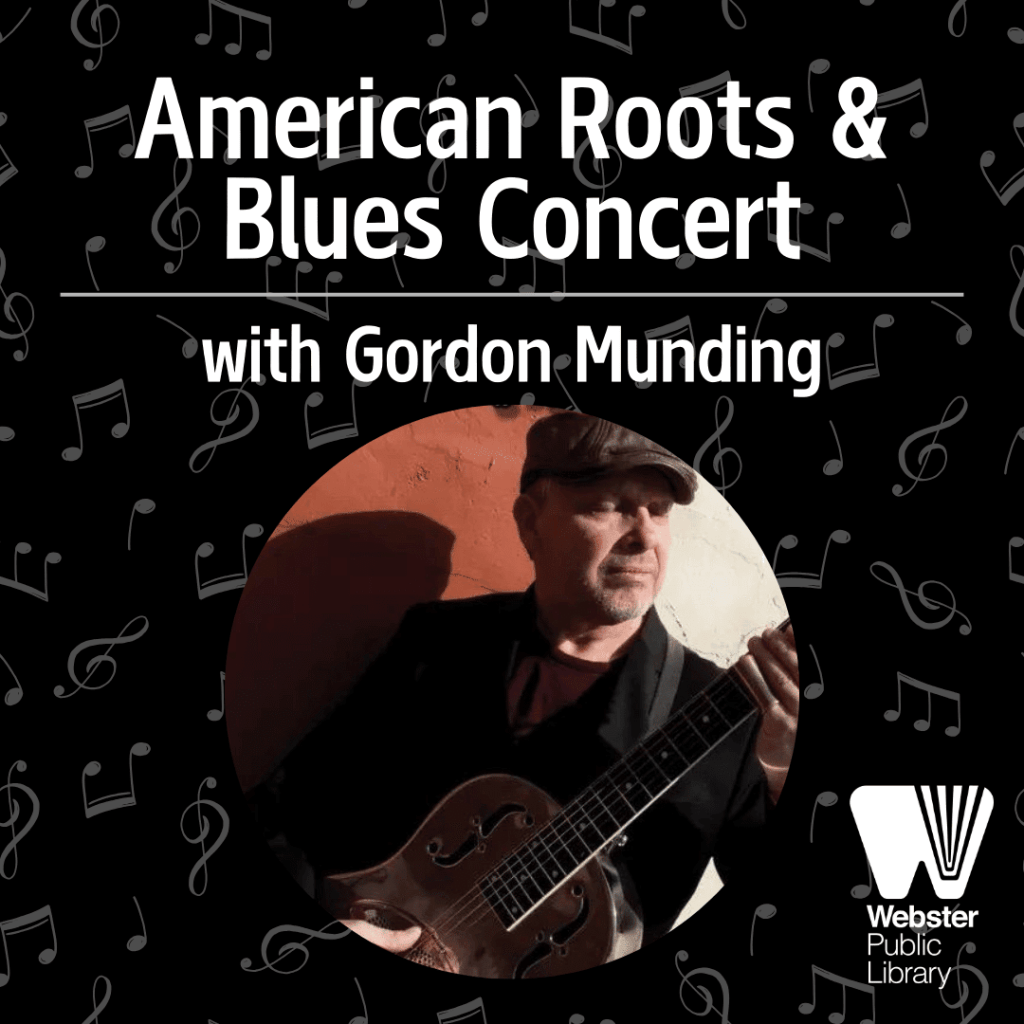 - American Roots & Blues Concert with Gordon Munding, Thursday April 16 from 6:30 to 7:30 p.m. Gordon Munding sings and plays authentic Americana roots & blues music featuring slide guitar, fancy fingerpicking, and timeless tunes. Registration is required.