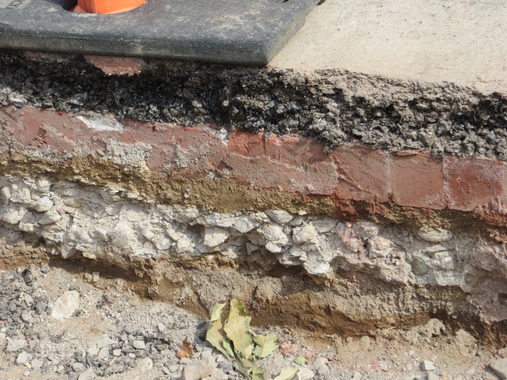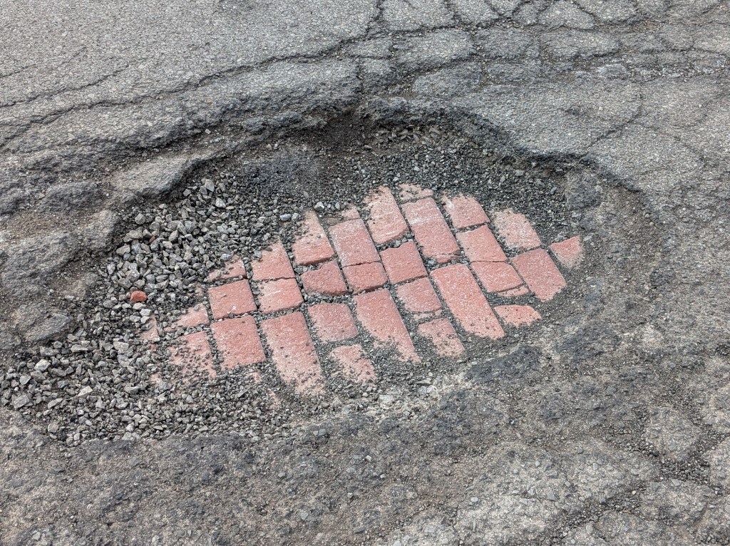 But here’s something neat that two of my readers actually alerted me to: the potholes on Main Street by Golden Boys are so deep that you can actually see down to the original brick pavers.