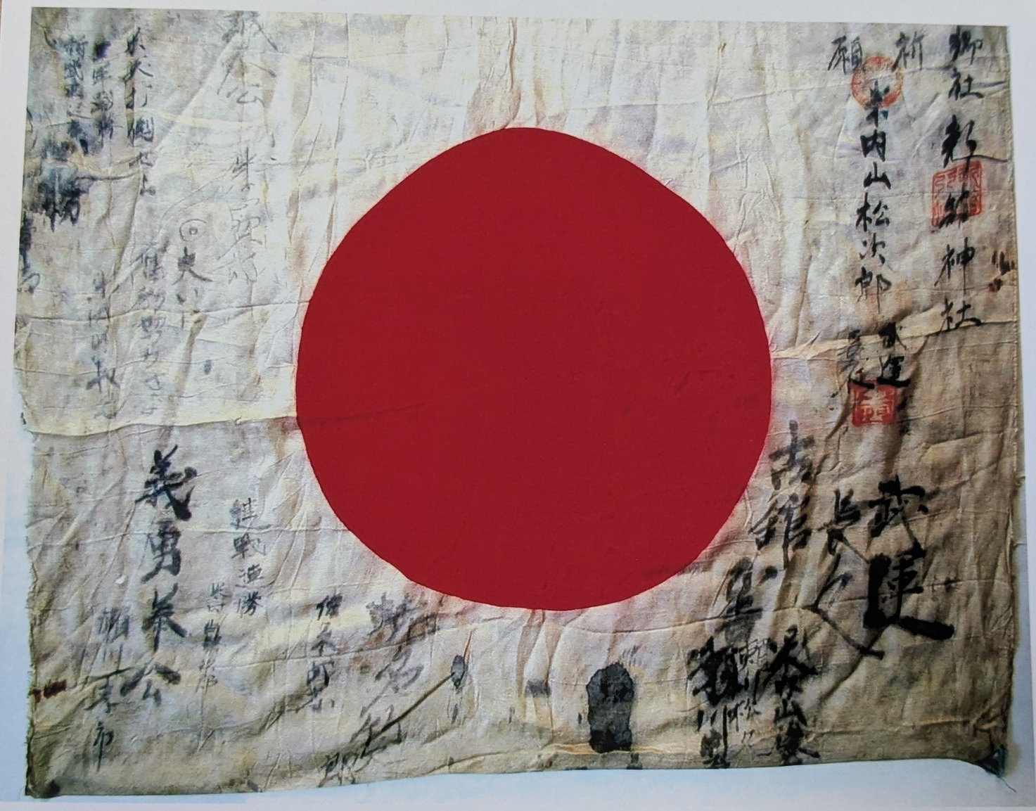The red disk in the center of the large flag, symbolizing the Rising Sun, was surrounded by names and symbols written in Japanese kanji. They included the soldier’s name – Matsujiro Yonaiyama – and well-wishes from family members and friends. A bullet hole and blood were also still visible. Bill realized the profound personal significance of what he had found, so he folded the flag carefully and tucked it inside a leather pouch to keep it safe during the long trip home after the war.