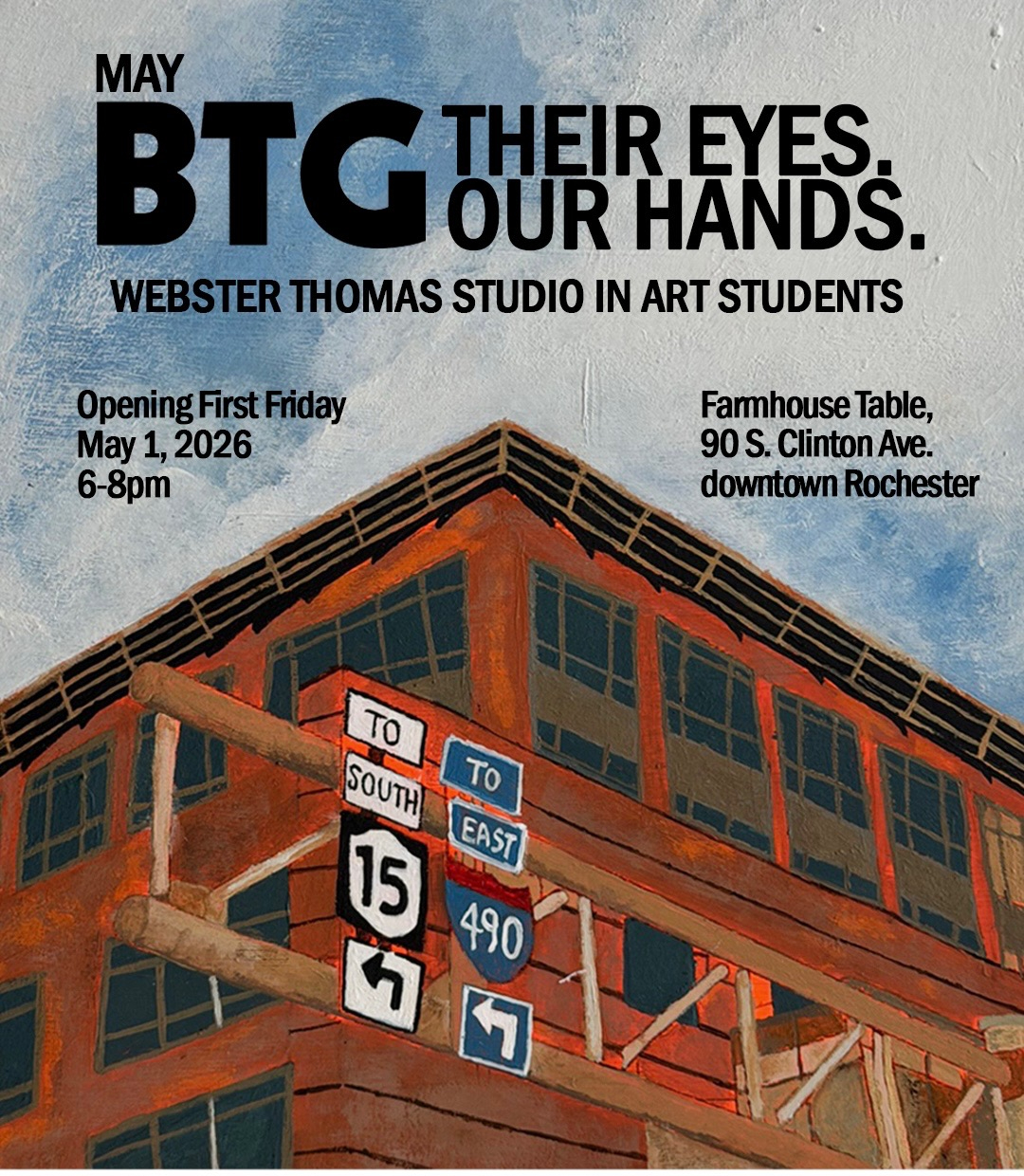 The Their Eyes, Our Hands art exhibition will kick off with an opening reception on Friday May 1 from 6 to 8 p.m. The event will take place at the Behind The Glass gallery, located on the second floor of Farmhouse Table at 90 South Clinton Avenue, Rochester. For those unable to attend the opening reception, the display will remain up and open to the public throughout the entire month of May during normal business hours: Monday and Tuesday, 7 a.m. to 2 p.m., Wednesday through Friday, 7 a.m. to 8 p.m. and Saturday and Sunday, 9 a.m. to 2 p.m.