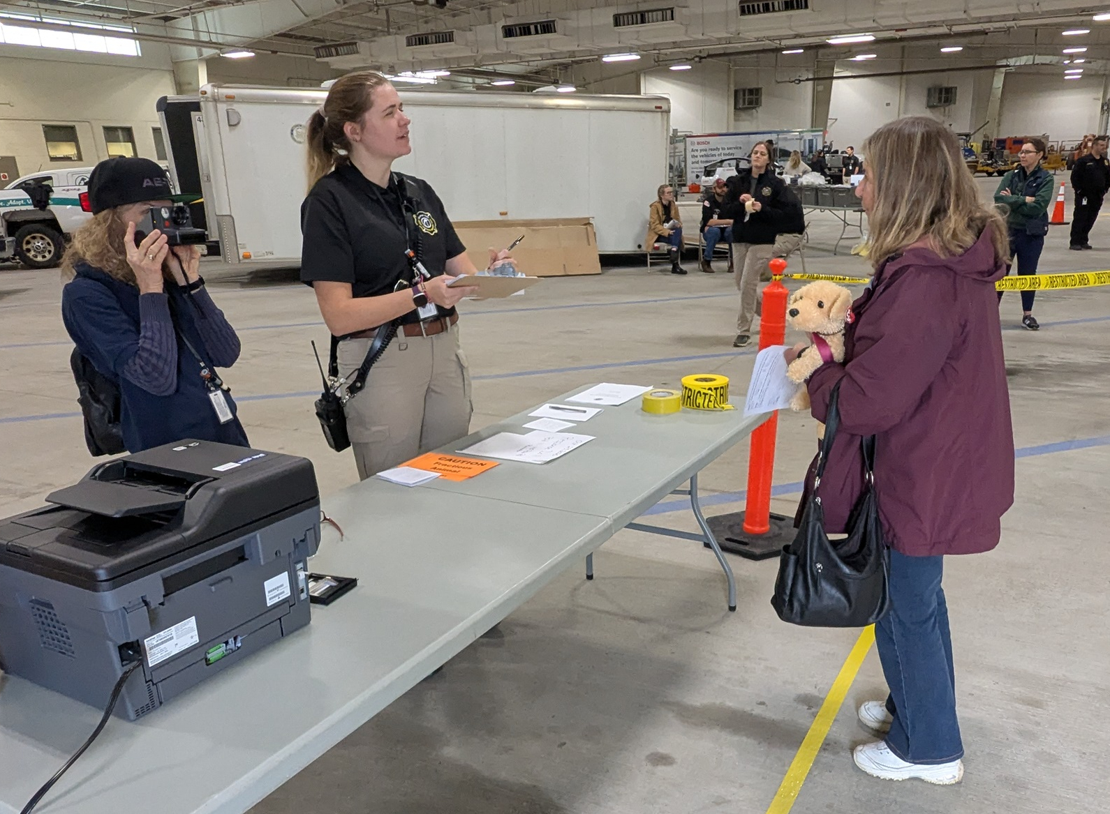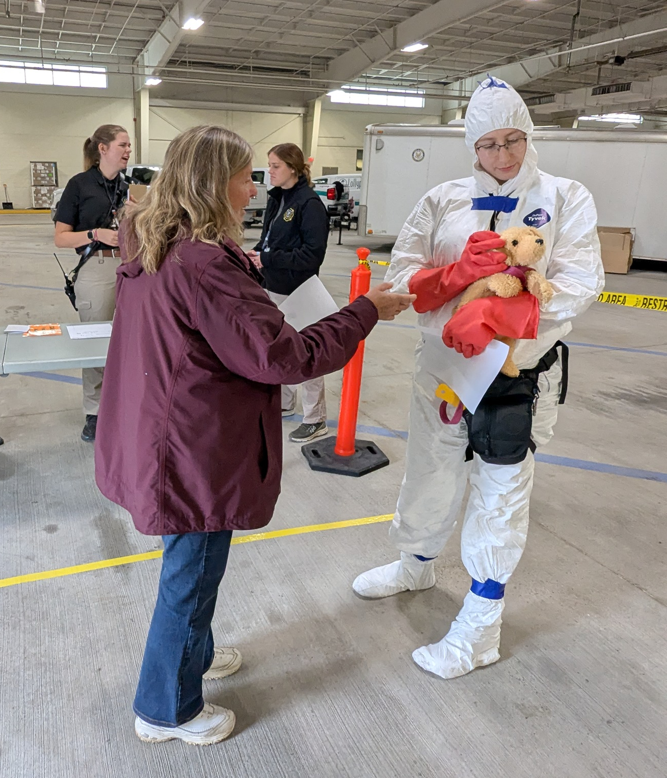About a dozen community volunteers (including me) participated in the effort, bringing our own live pets (including a guinea pig) or stuffed animals. Our first stop was to drop them off at the decontamination area, where we were photographed (to make sure we were reunited with the right animals) and received registration paperwork. It was really interesting watching the staff members manage a lot of little details you wouldn’t think about — even to the point of how to handle the paperwork without becoming contaminated. After a short while, we received a call telling us to drive around to another area and pick up our pets.