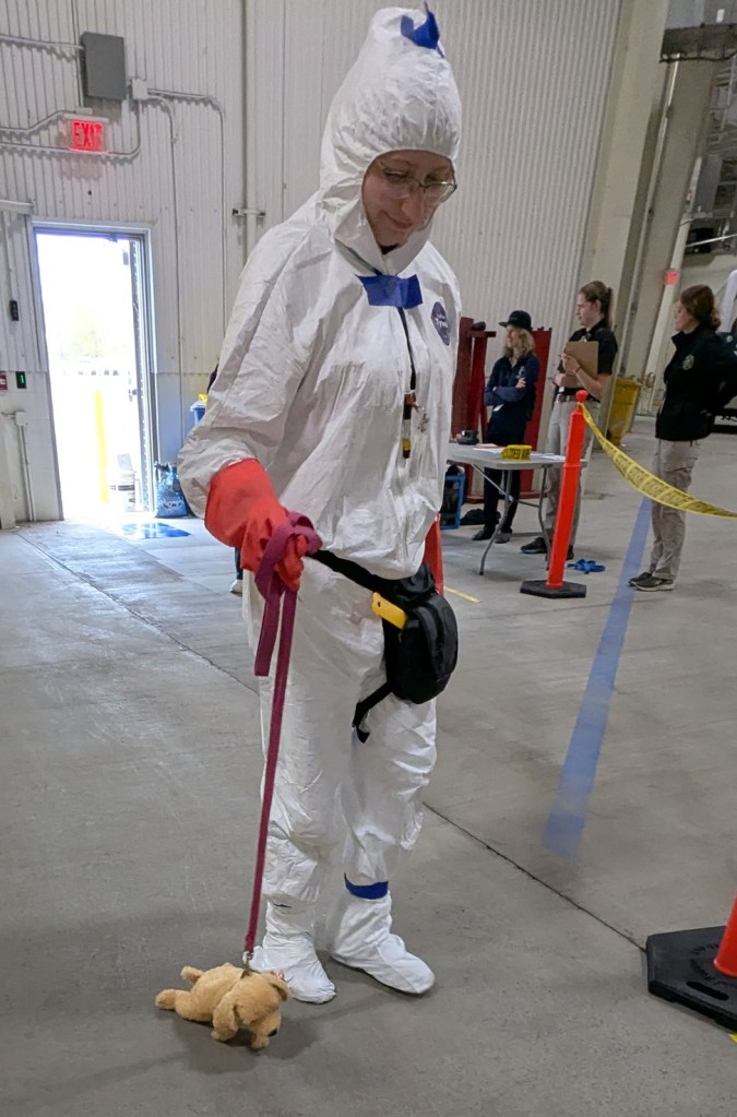 Janie Veldhuizen from Penfield checks in her “puppy” GretelAn emergency response team member receives Gretel …… then leads her to the decontamination area