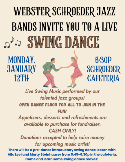 The Webster Schroeder High School jazz bands will be hosting an evening of swing dancing on Monday, Jan. 12 in the Schroeder cafeteria.