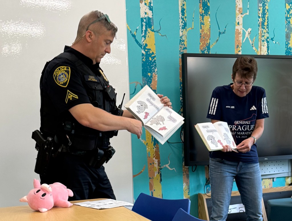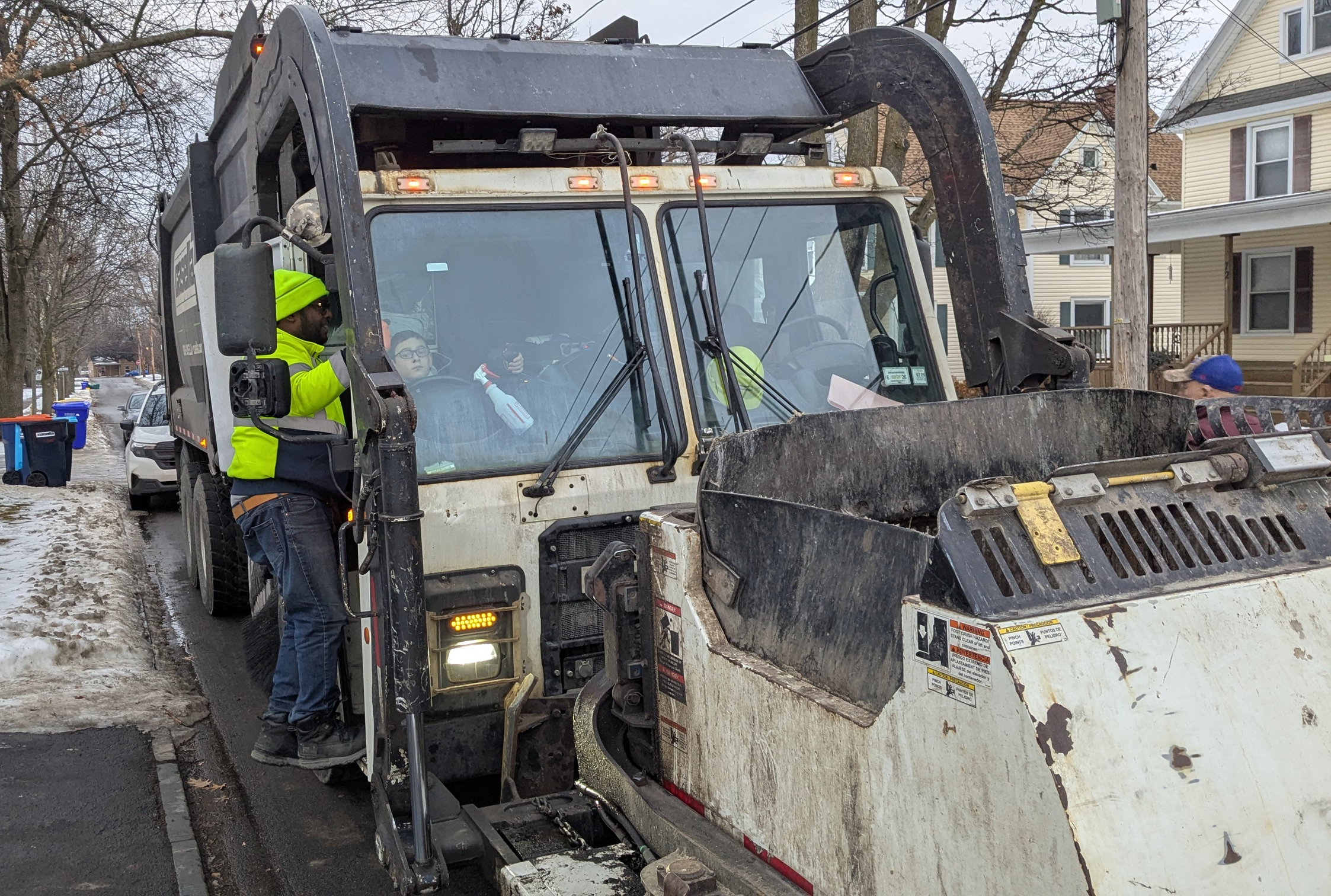 After Pierson had a chance to thoroughly inspect his shiny new recycling cart, Casella truck driver Anthony McQueen invited him to sit in the truck and operate the side-loader, grabbing and “emptying” the can into the truck’s bay. Then Pierson placed his first full bag of returnables into the can — the first of many to come, for sure.