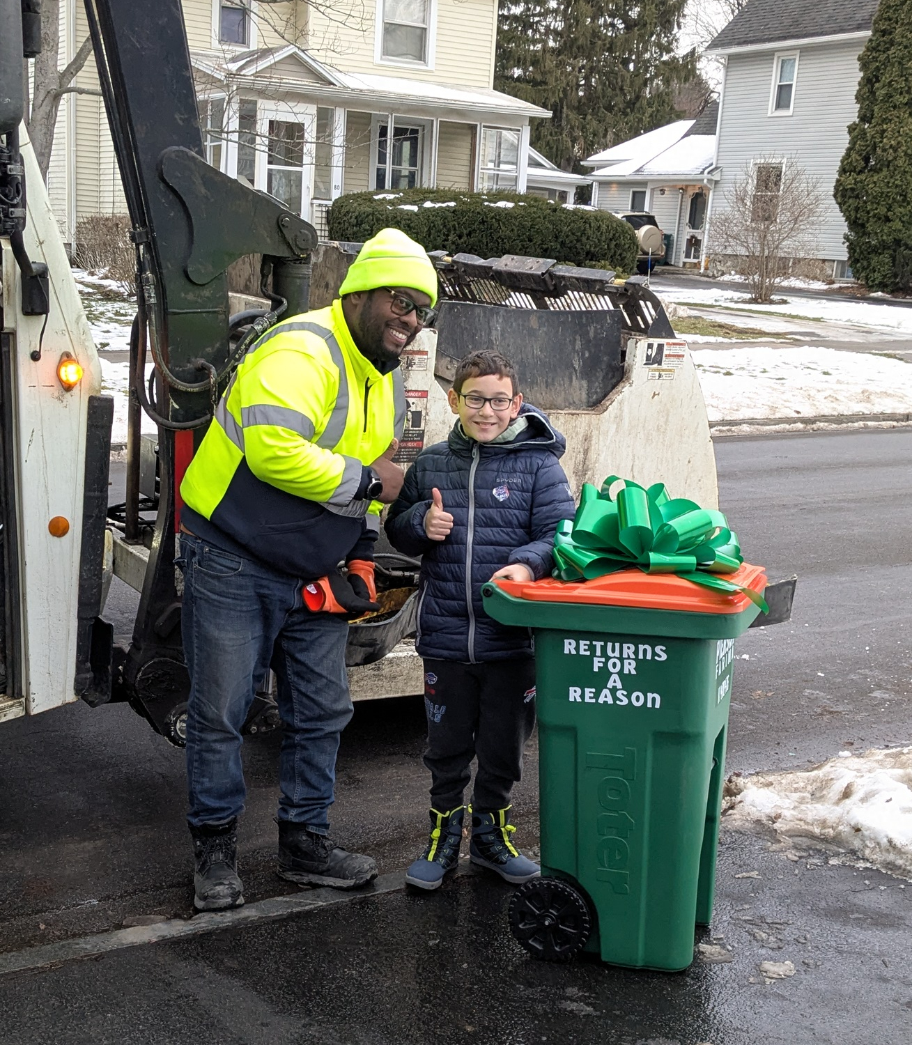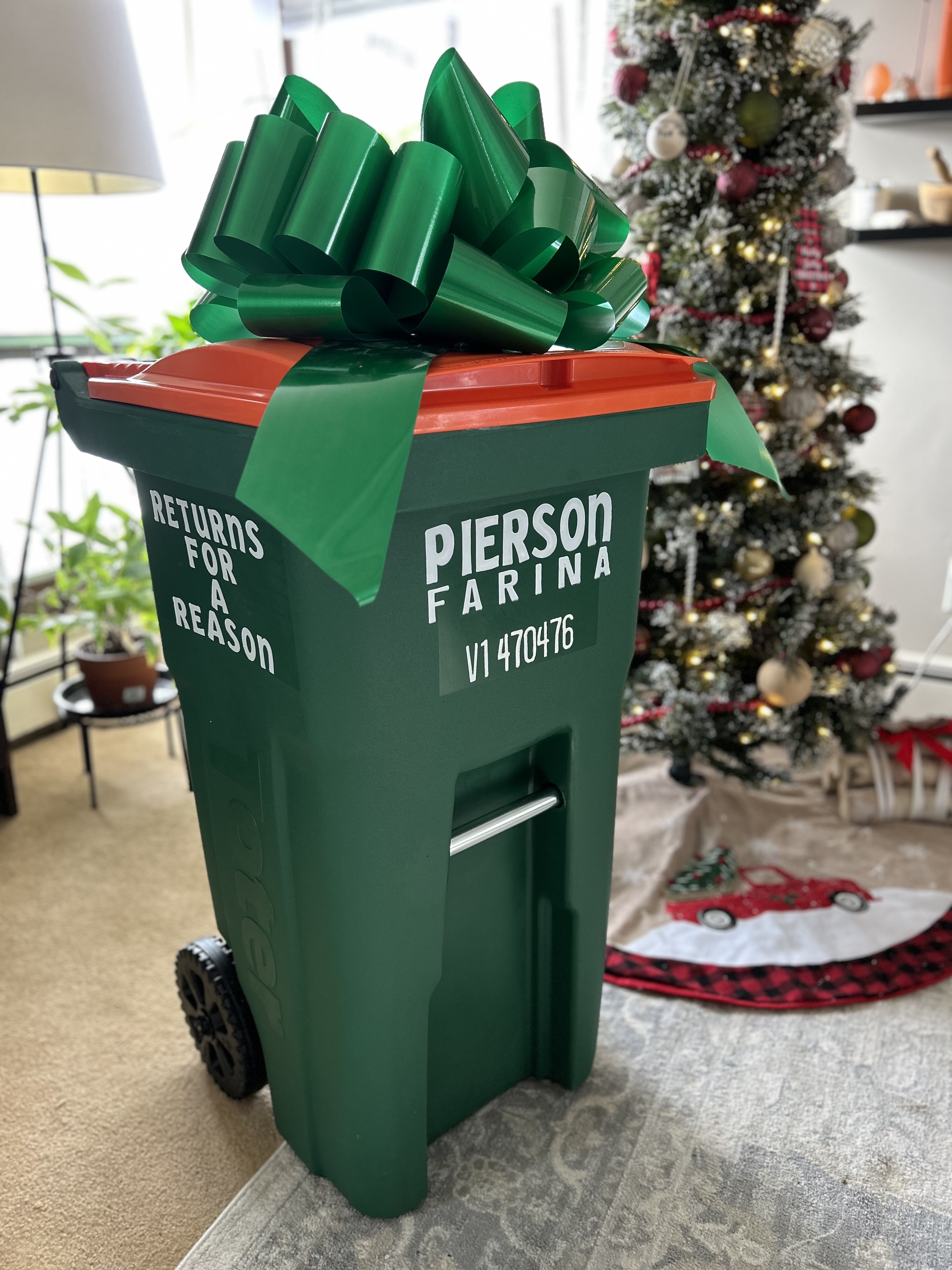 At first, Pierson had no idea why a garbage truck was idling outside his house. But when he stepped and spotted the Toter — a green one with an orange lid — topped with a giant green bow and personalized with his name and “Returns for a Reason,” he was speechless.