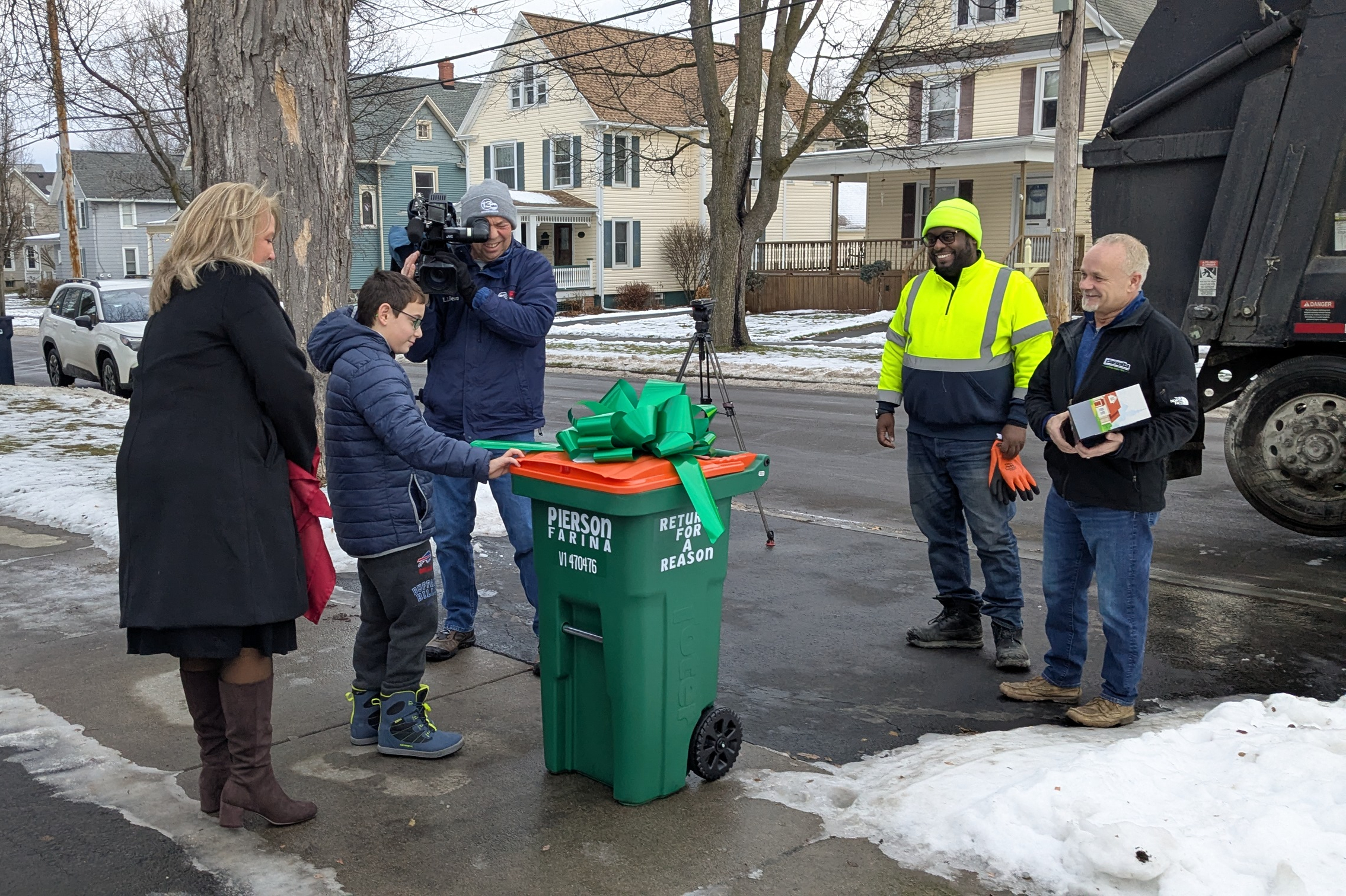 That heartwarming event unfolded Wednesday afternoon when Toter Regional Sales Manager Jamie Butler pulled up in front of Pierson’s house and unloaded the Toter cart. Moments later, a Casella Waste Systems side-loader garbage truck rumbled up behind her and started blasting its horn.