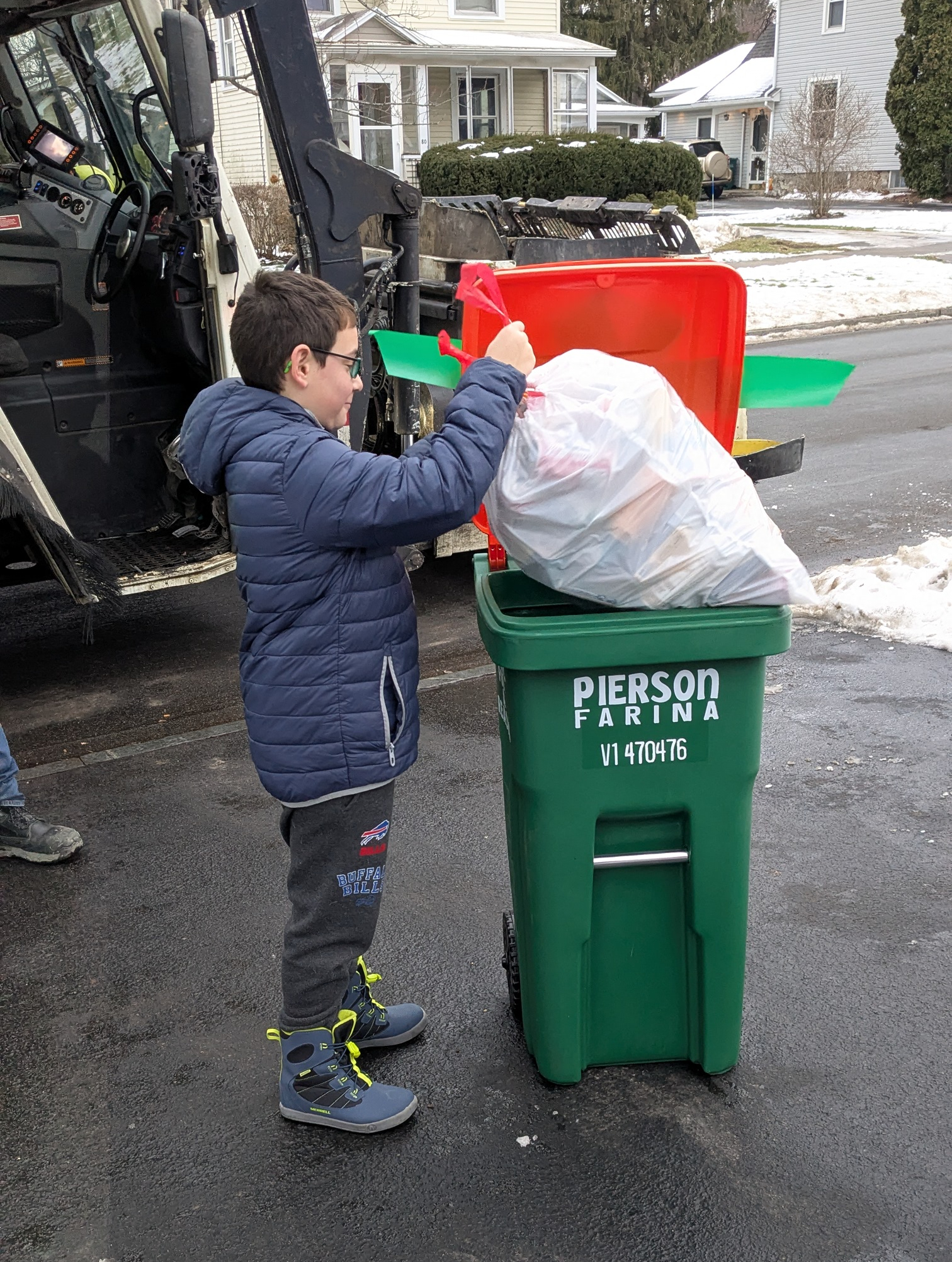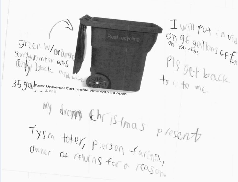 Pierson loves garbage trucks and garbage cans so much that back in October he wrote a letter to Toter, Inc., a waste container manufacturer based in Statesville, NC, asking for his “dream Christmas present,” an official Toter wheeled cart — specifically, a green one with an orange lid.