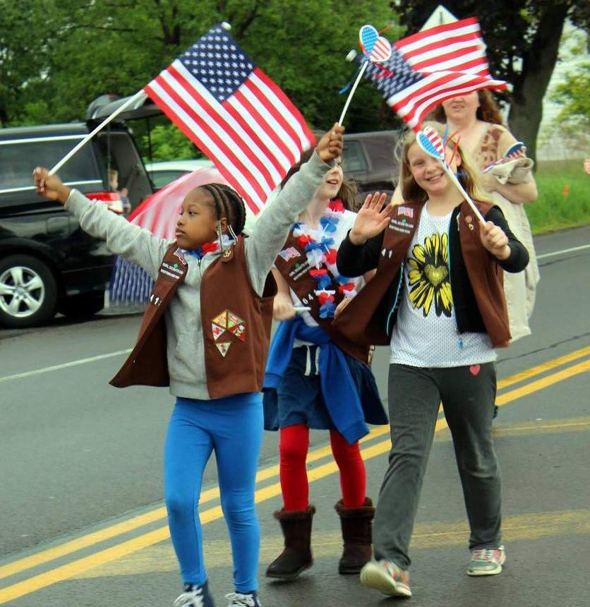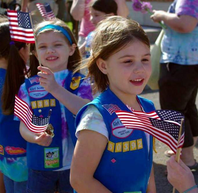 Nothing quite compares to the excitement of marching in a real parade. These Brownies were getting ready to join their troop for the 2014 Memorial Day Parade.