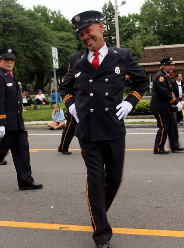 This visiting firefighter, marching in the July 2017 Firemen’s Parade, was having a grand old time entertaining the crowd.