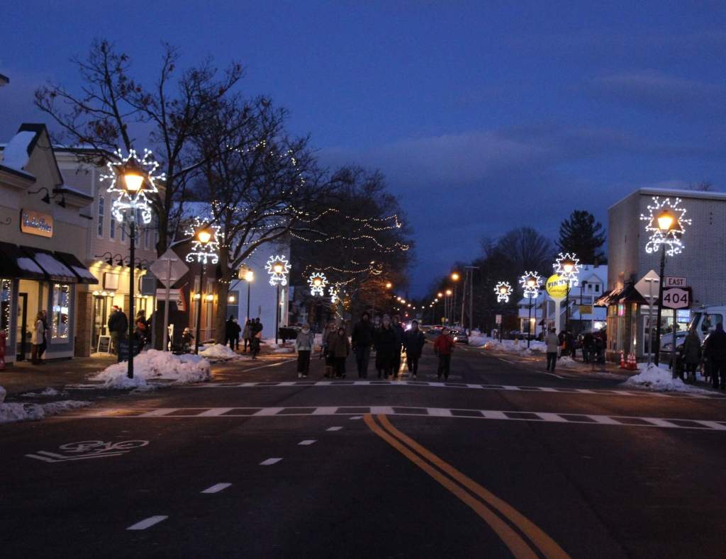 The Village of Webster sparkles every winter, like this quiet evening during the village’s White Christmas celebration.