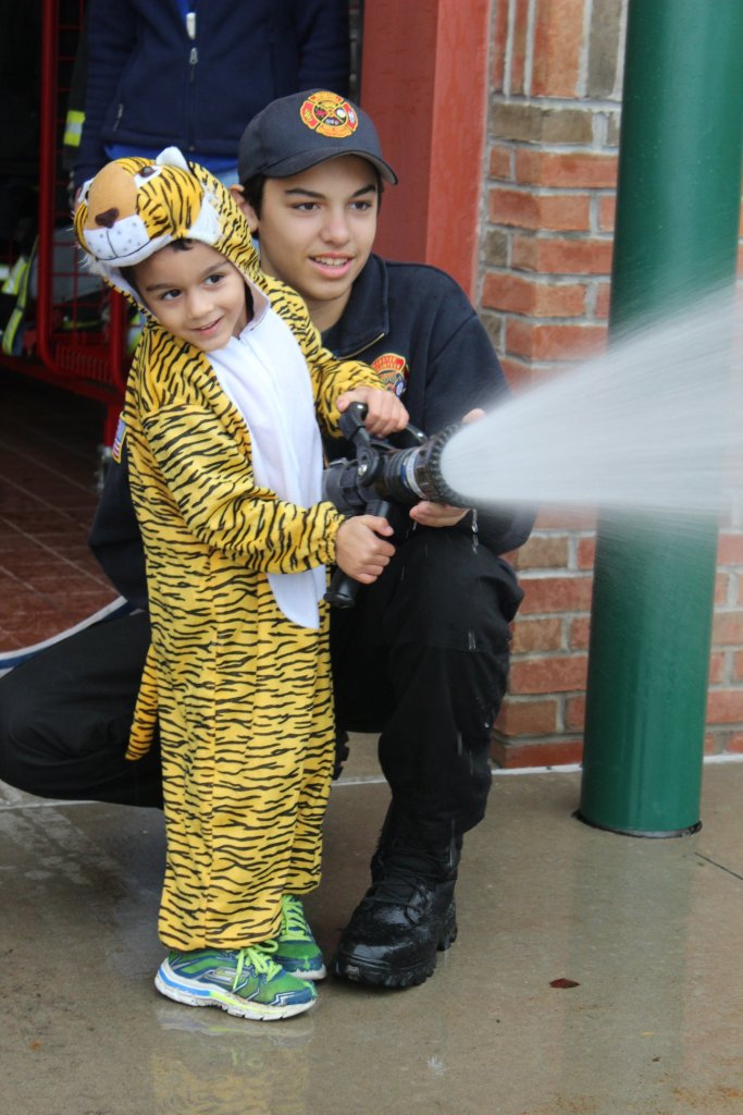 A young Webster Volunteer Fire Department Explorer shares the thrill of being a real firefighter with a participant of the 2018 Village of Webster Trick or Treat Trail.
