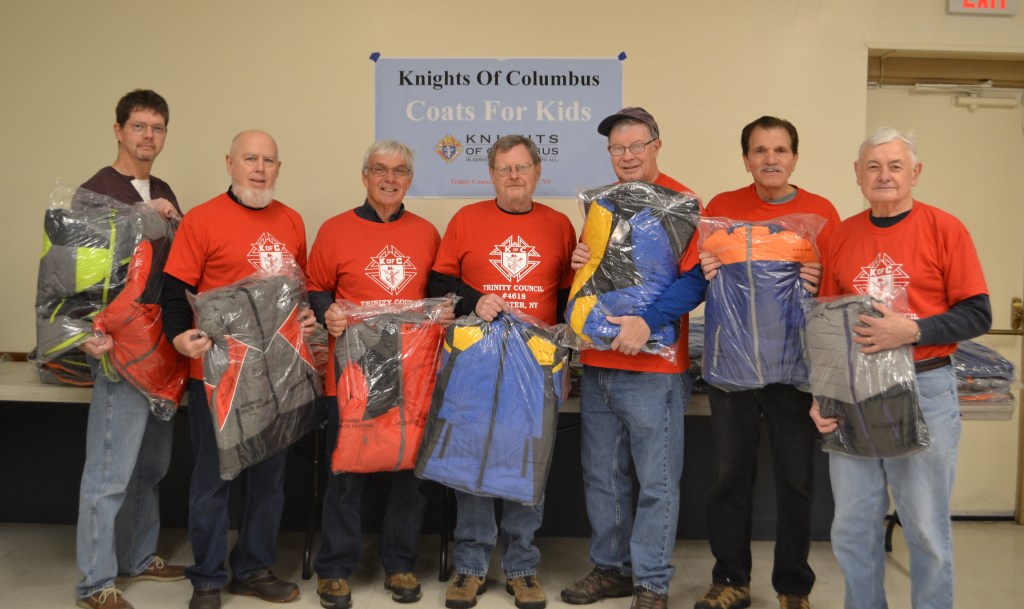Back in September I posted a blog about the Webster Knight of Columbus‘ 14th annual Coats for Kids initiative. Its purpose is to raise funds to purchase and distribute new winter coats to children in need throughout Monroe and Wayne counties. Over the last 13 years, our local KofC Trinity Council #4618 raised enough money to provide more than 4,100 coats AND 288 pairs of sneakers.
