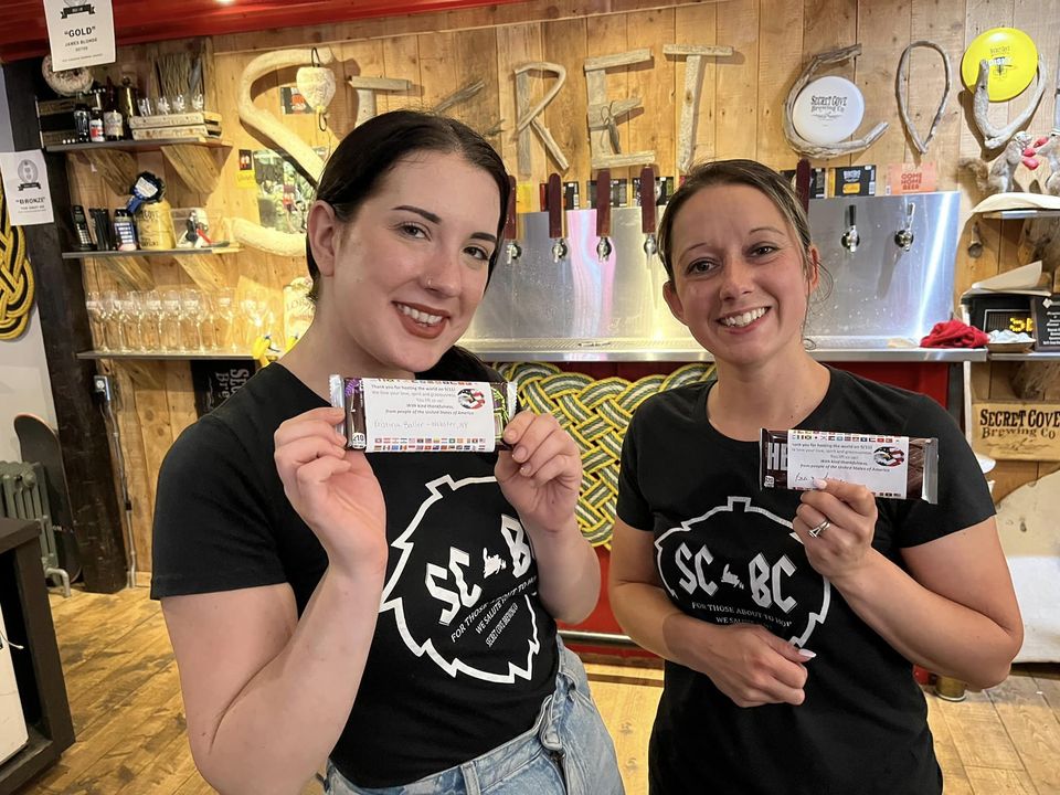 It took them only a few days for Bob and Peggy to start distributing their candy bars, and it happened even before they reached the province. The first ones went to some fellas from Newfoundland they met at a historical site. The first ones the entire Soul Connection group handed out were at the Secret Cove Brewing Company in Port au Port, NL. Bob reports that “Yes, there were some tears! One family had their 10-year old boy come up to say thank you and shake hands as they left.”