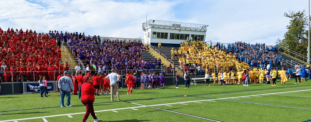 In previous years the rally took place in the gym, and the noise was deafening. This year for the first time, no doubt in deference to COVID-19, it was held outdoors in the stadium (fortunately the weather was gorgeous). The pep band performed, and mini-contests like Can-Jam and “who can scream the loudest” were played for class points. The noise was still deafening.