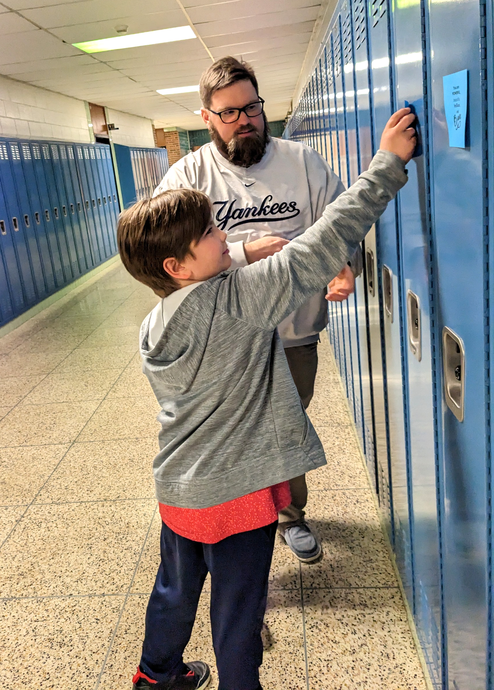 At Willink Middle SchoolInspirational posters were also hung at each schoolAt Spry Middle SchoolKerry Lang, Elementary Special Ed. TOSA, and PSTA Chair Stacie Peters in the GOAL hallway at SchroederDustin Baily and his son Brian helping out at SchroederMore hard-working Schroeder volunteers