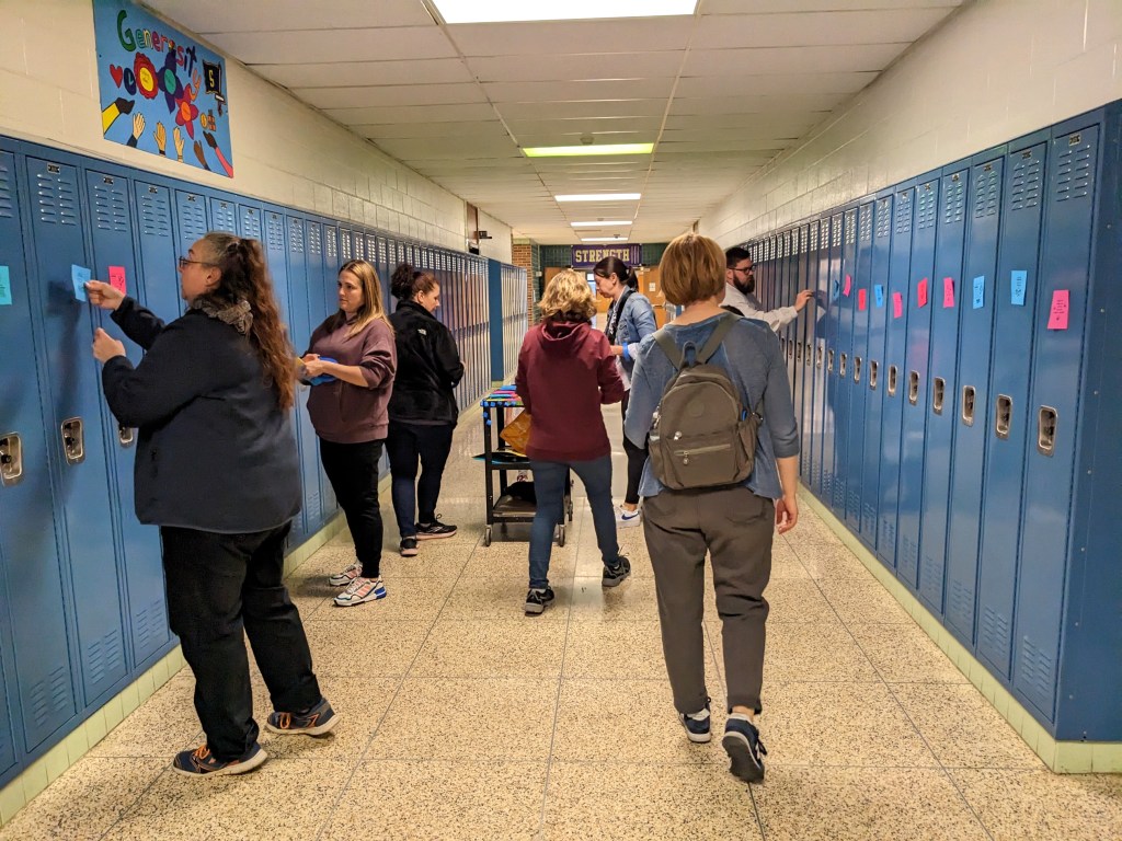 Thanks to the efforts of dozens of volunteers who fanned out to each of the secondary buildings on Tuesday night, almost 7,000 inspirational notes were posted, one on every single locker at Schroeder High School (including GOAL), Thomas High School (and OWL), Willink Middle School (and OWL), and Spry Middle School. The volunteers also hung a number of motivational signs throughout the buildings.