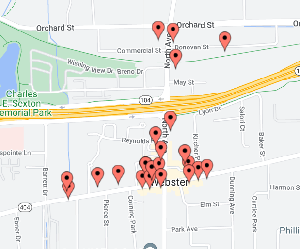 This map shows the location of ten parks in or near the Village of Webster. Click here, or on the link below the map, to see the full map.