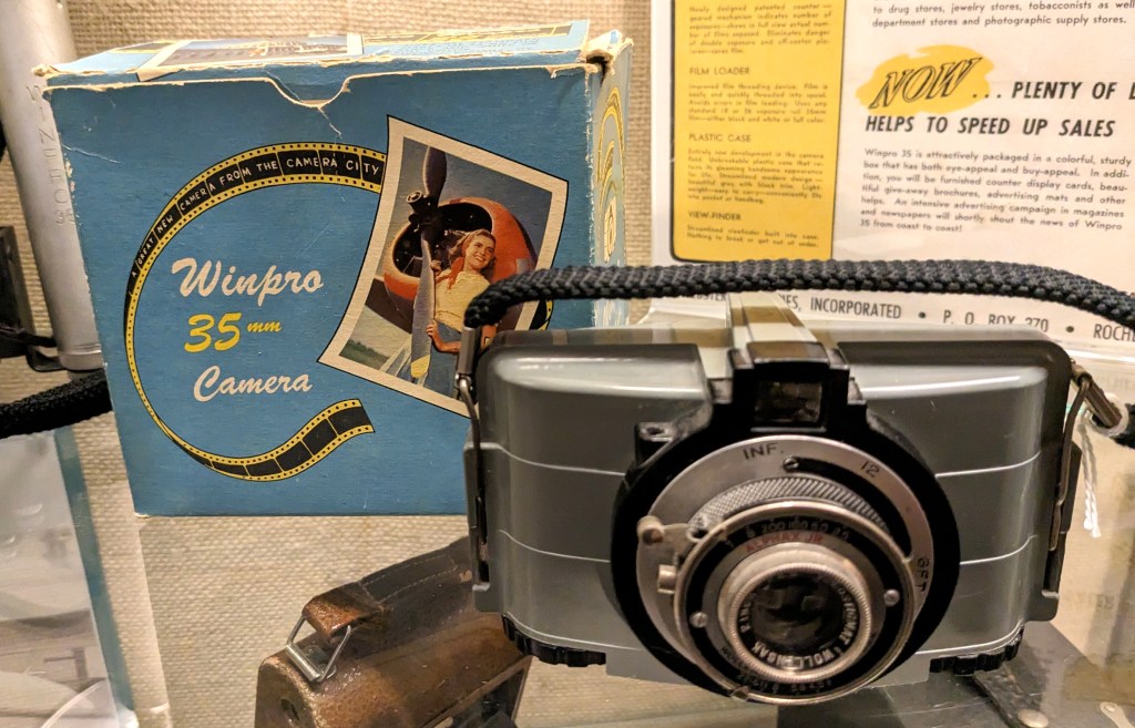 From 1948 to about 1954, Webster Industries, Inc. produced the only camera ever made in Webster. It was called the Winpro, and was the first point-and-shoot 35 mm camera made entirely of molded plastic. The factory was at 36-38 Commercial St., near where Response Care, Inc. is now located.
