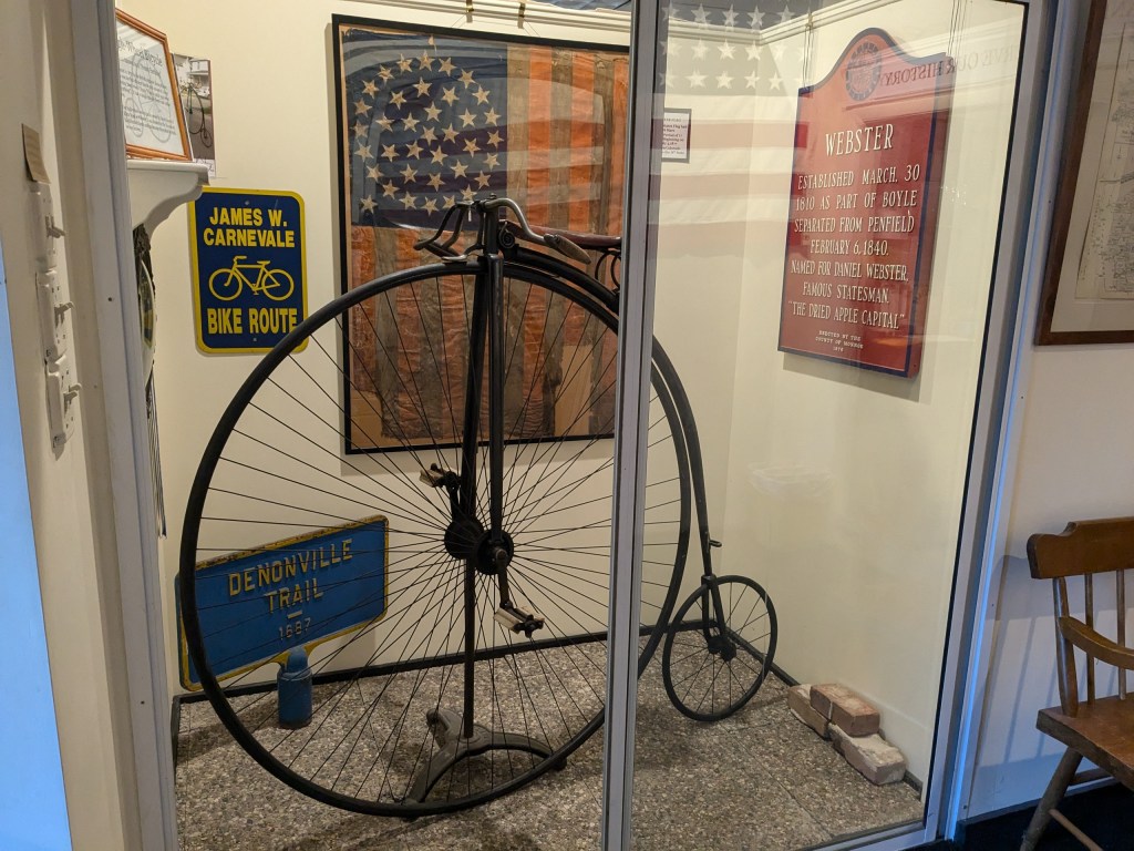 If you’ve ever visited the Webster Museum, chances are you’re already familiar with the penny-farthing. It’s that old-fashioned bicycle with the big front wheel and little back wheel that sits in a case just inside the museum’s front door.