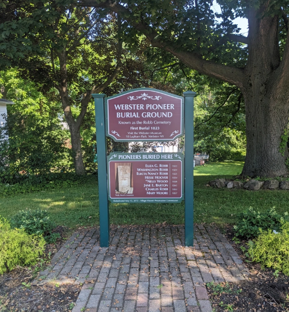Robb Cemetery is an 8700-square foot parcel of land on East Main Street in the village of Webster, just west of Phillips Road. It is a true pioneer burial ground, with at least eight known burial sites dating back to 1823.